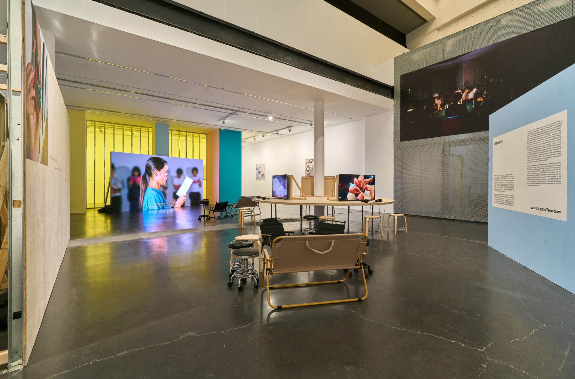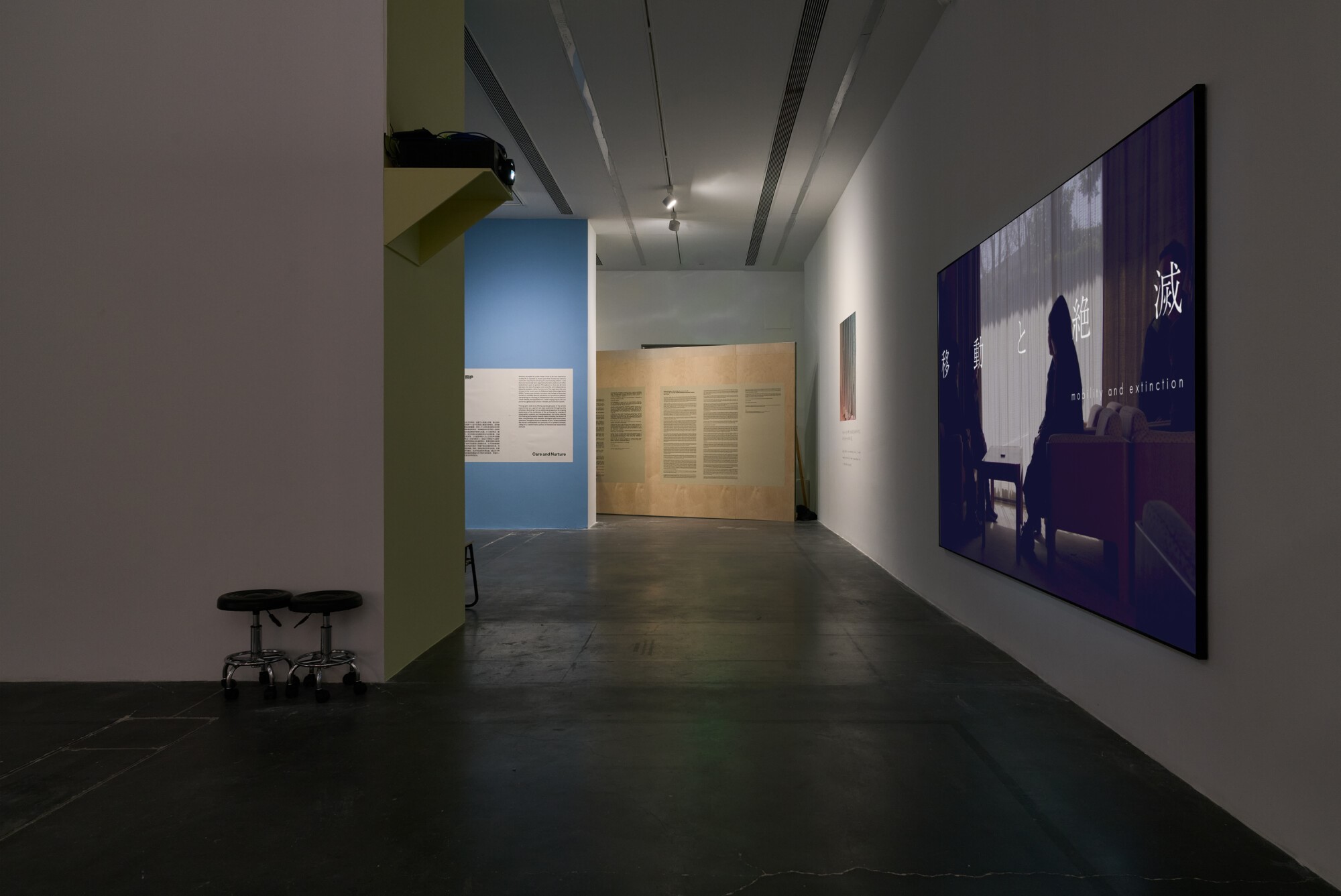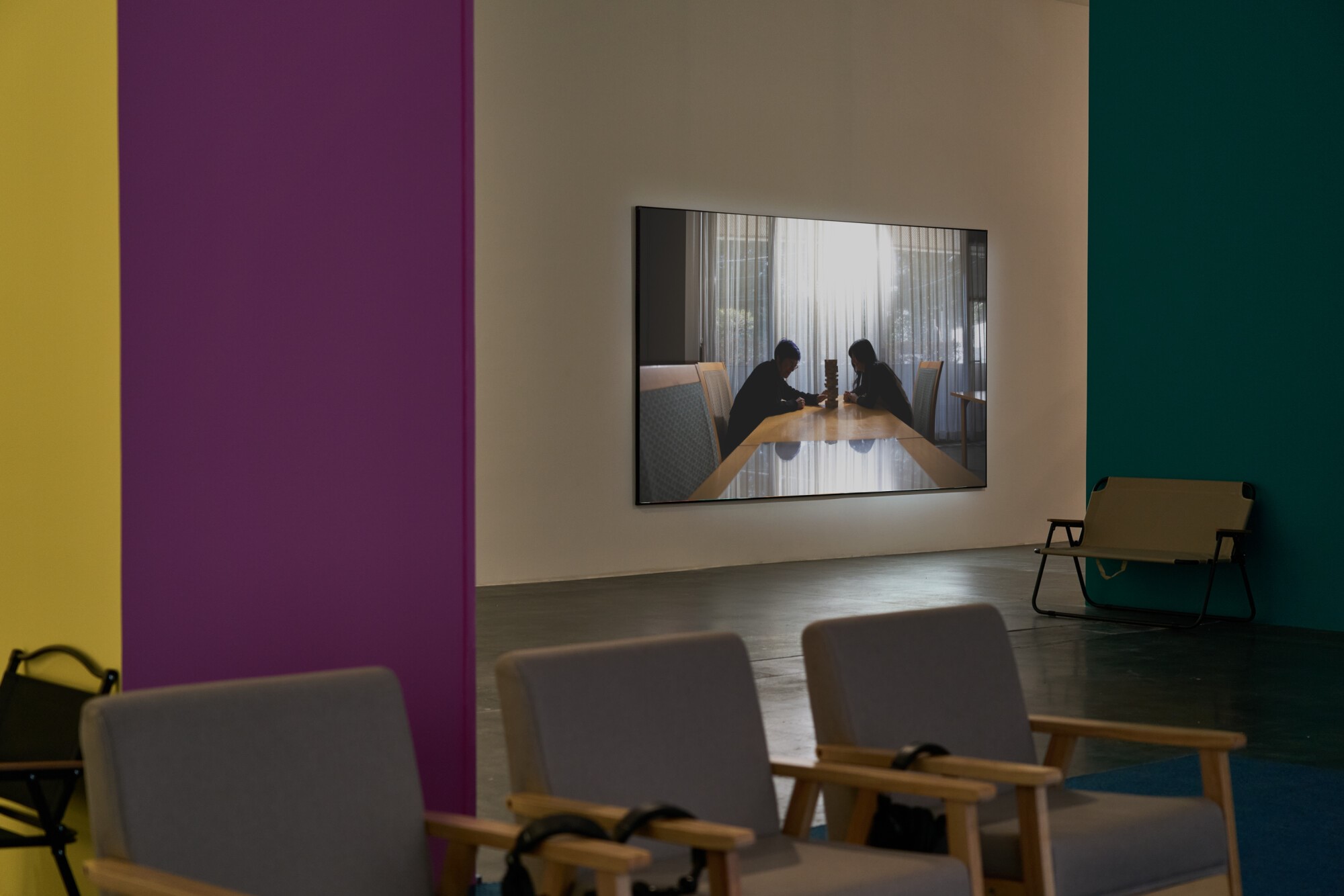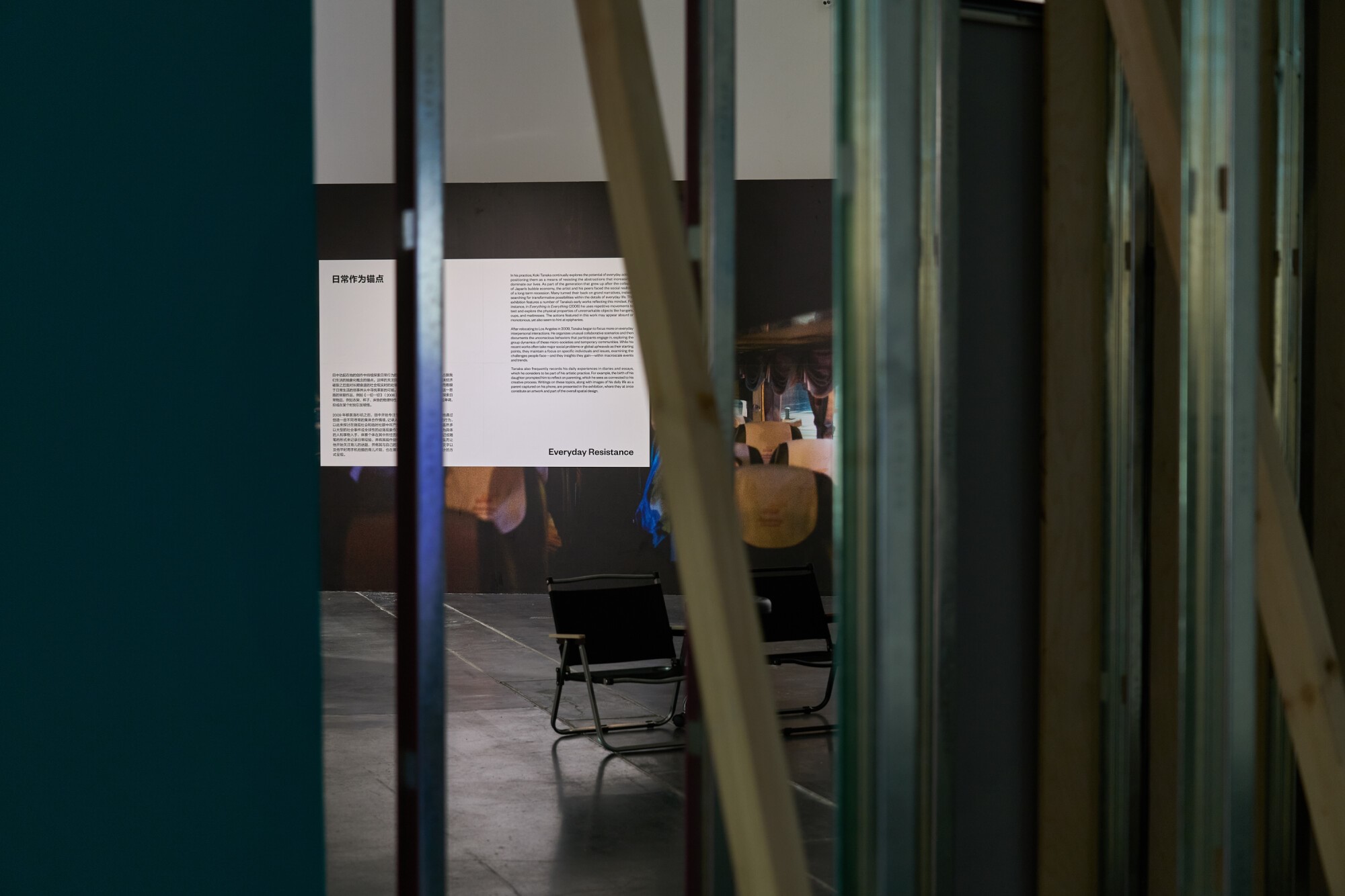 本次展览在空间设计上也延续了“临时共同体”的主题。作品的屏幕不依附于固定墙体,而是被安置在简易木质结构上;展厅中散落的椅子可被观众自由移动。观众因而可以在观看过程中随意调整观看视角,或即兴地自发聚集,或独自停留。空间的开放性与不确定性,使展览本身也成为一个不断生成、又随时可能瓦解的“临时共同体”。