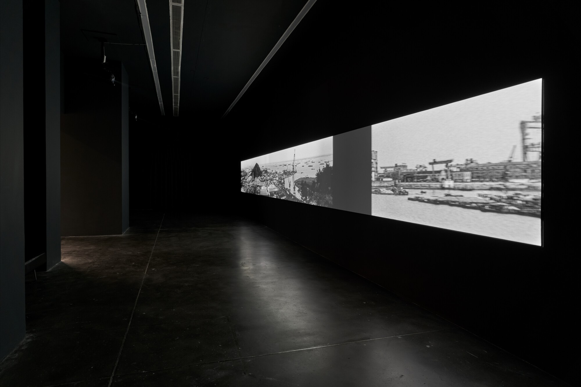 《攀枝花》(2012)拍摄于被誉为“万里长江第一城”的攀枝花市,作品视角由被群山包围的工业城市边缘延伸,建筑与山脊构成两个相对的三角形几何结构,使城市与山体不再对立,而是彼此呼应与对照。在《虎跳峡》(2012)一作中,艺术家以俯拍的取景方式将远山的水平线与江水共同塑造出一个略带错位感的空间;展览特别将该作品横向铺陈于一张弧形布条之上,而非采用竖向壁龛式陈列,还原了拍摄视角所蕴含的空间感和江水湍流而下的速度感。而在上海长江大桥拍摄的作品《海门》(2012)画面中,长江入海口的宽阔江面几乎消解了地平线,只有近处右下方一艘意外闯入的运沙船成为时代的痕迹。