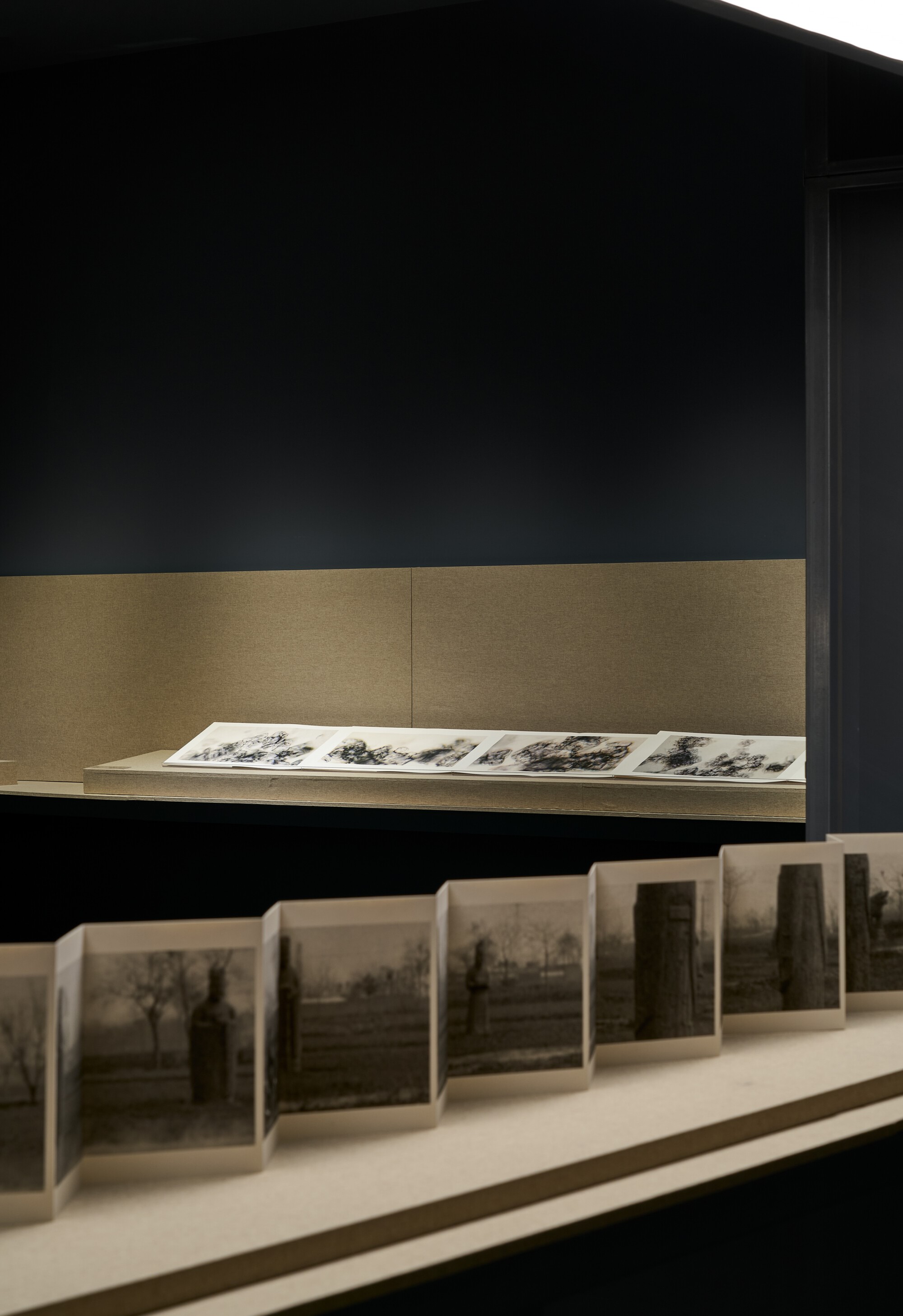 除“长江万里图”系列外,本次展览亦呈现多件艺术家围绕在文化史中反复注脚的地点和主题而展开的作品。在《无字碑》(2007)中,秋麦聚焦中国唯一一位以皇帝身份执政的女性——武则天的石碑表面。这件与真实石碑大小相同的作品以其粗粝的胶片像素使石碑宛如重新回到“无字之时”,那些被后朝文人题刻的、几乎消失的文字覆盖于颗粒之中,呈现一种带有历史回声的朦胧感。纸本的轻柔与石碑的物理重量形成鲜明对照,也唤起人们对传统碑刻拓印的联想。而此刻,摄影承接了对时间的记录,又因清晰度的变化,与原碑产生微妙偏移,使图像在再现与差异之间展开张力,引发观众对于历史追溯、转译与再现的思考。《盐图》(2016)、《影幔#8b》(2010)、《北宋神道》(2005)等作品则展现秋麦对不同题材与观看方式的持续探索,从显微镜下的盐晶、雾气中的庐山古木,到伫立在农田里的北宋神道雕像,艺术家不断在真实地理与想象空间之间铺陈新的图像层次。