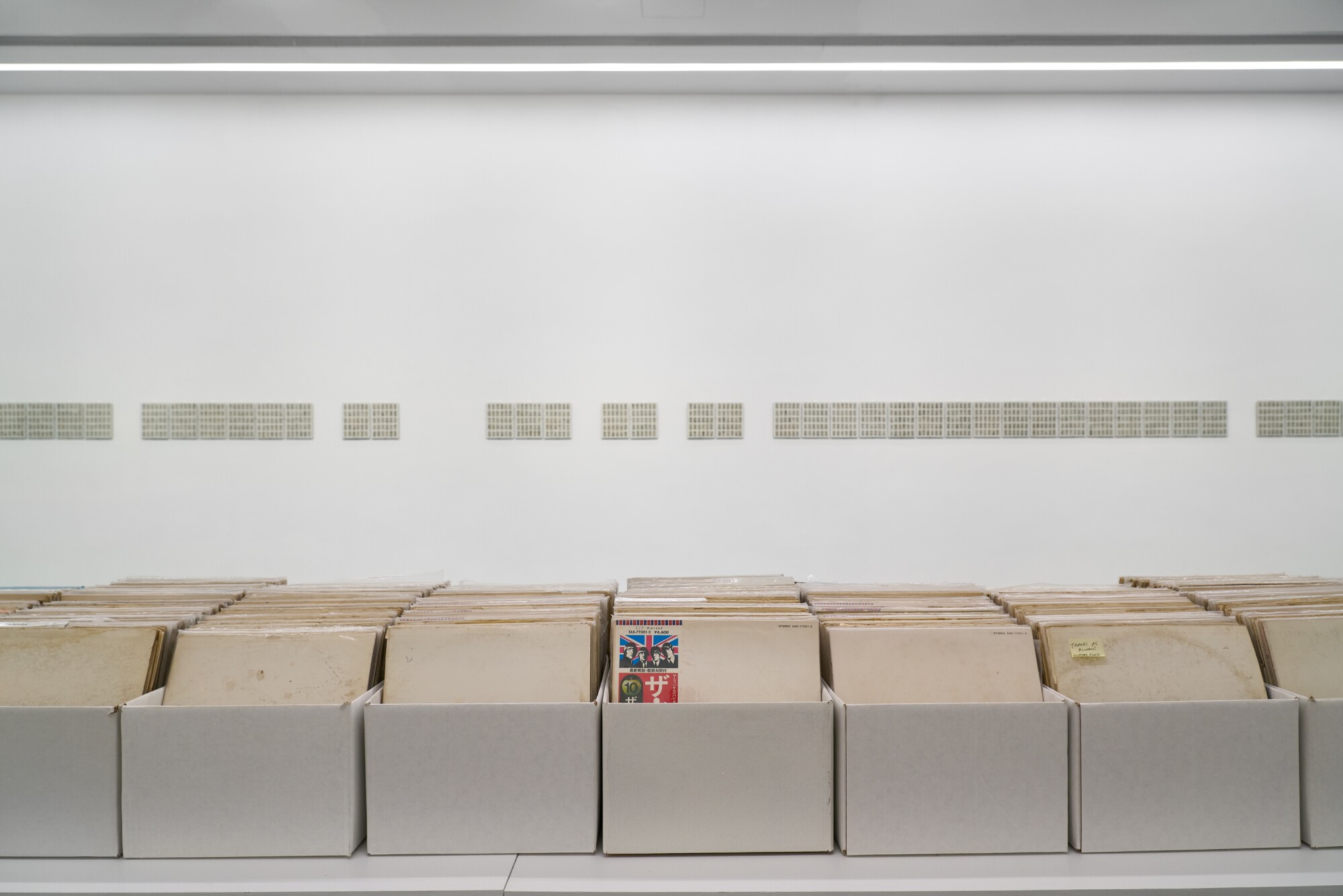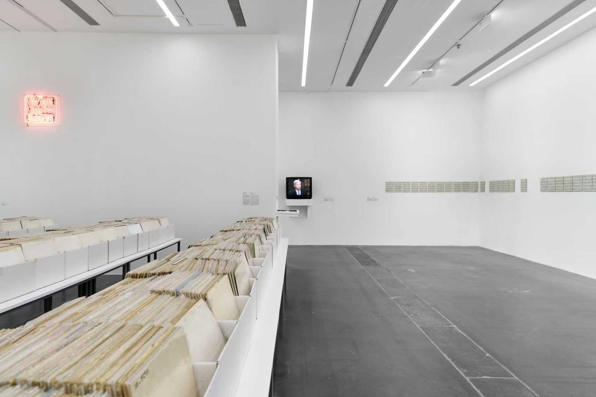 展览的核心作品之一《我们收购白色专辑》(2006-2025)以不断积累的实物档案的方式展开,乍看像一间唱片店,但其中的唱片并不出售。此作品所收集的皆为英国摇滚乐队披头士1968年发行的同名专辑(即广为人知的“白色专辑”)。这张专辑几近空白的封面由波普艺术家理查德·汉密尔顿和披头士成员保罗·麦卡特尼共同设计,将极简主义美学引入流行文化。张能傑十五岁时购得第一张“白色专辑”,自2006年开始系统性搜寻这张首版唱片,并依据压印的独立编号进行归档;2013年在纽约艺术机构Recess的临街空间首次公开展出这一不断增长的收藏。陈列于此供观众翻阅乃至聆听的唱片,带有注解、污渍及其他磨损痕迹,封套上的随手涂鸦、留言与生活痕迹,构成一部“白色专辑”发行数十年以来的社会史,颠覆了“空白封面”的概念。此外,观众在此还可以聆听张能傑创作的一件声音作品。艺术家将最初收集的100张“白色专辑”的音频叠加,将生成的录音压制为黑胶唱片;唱片上的划痕、表面噪音以及微小的转速差异,使音乐逐渐转化为致密的音响纹理,既凸显了媒介的物质性,亦强调了原专辑音乐中本就存在的实验性色彩。