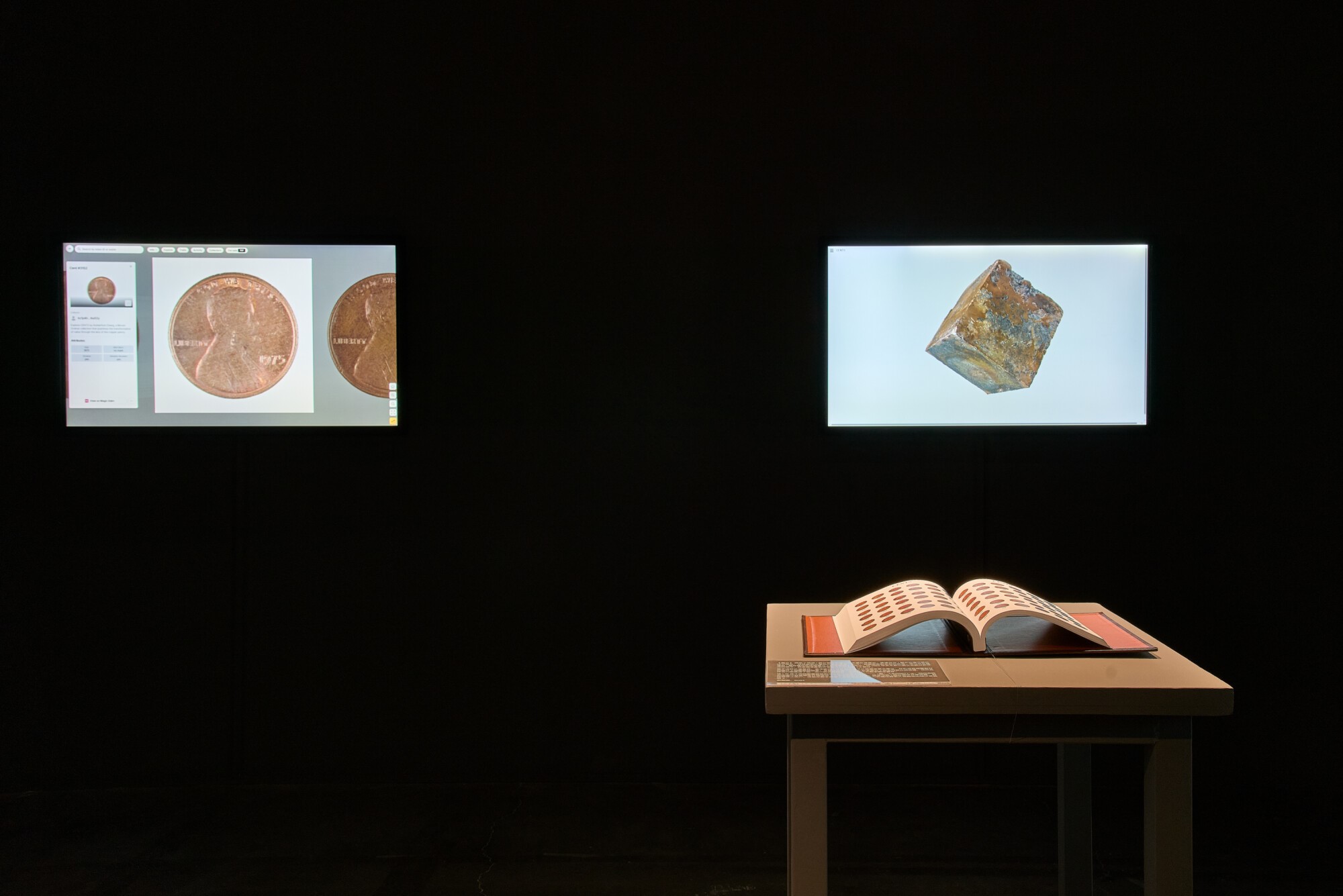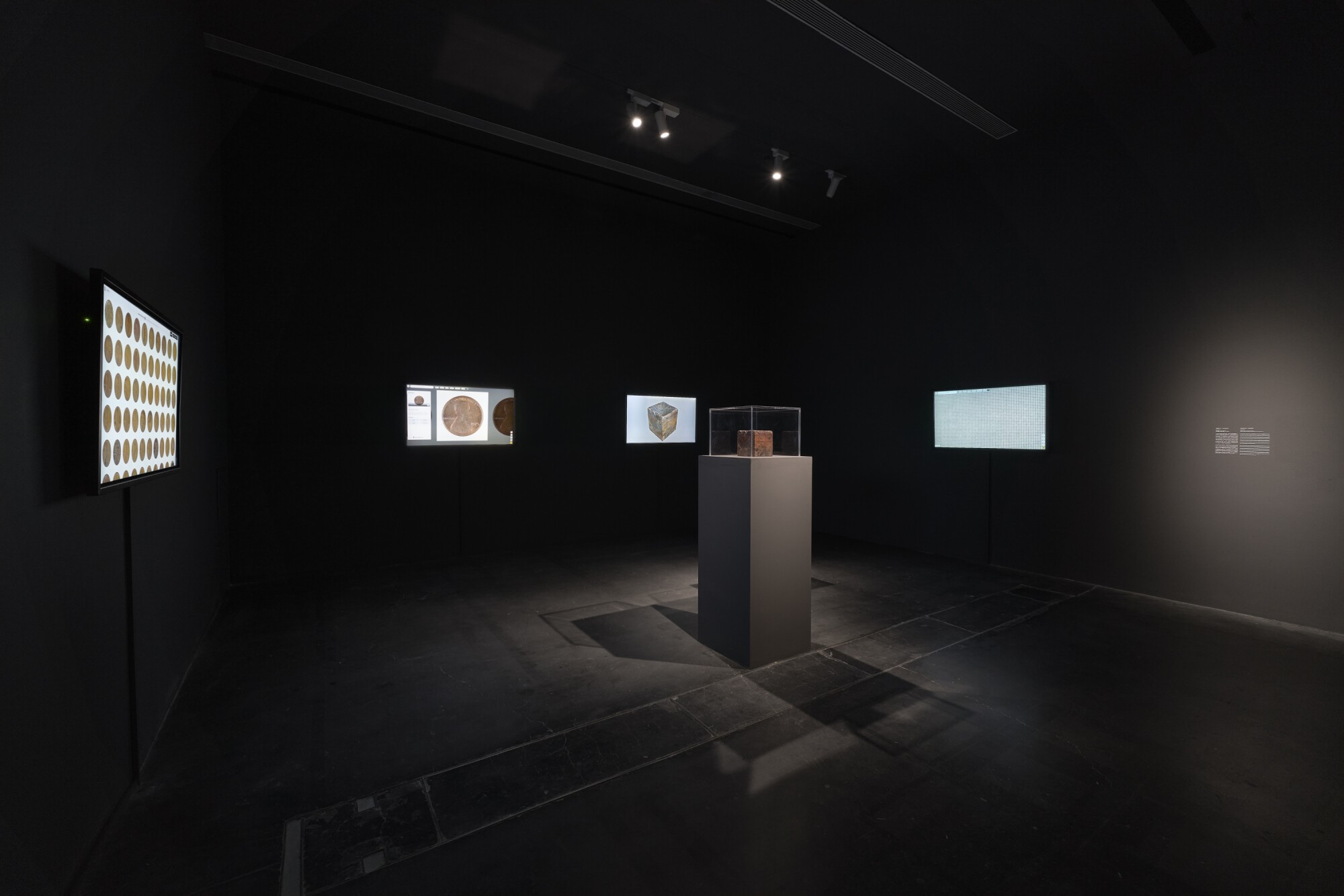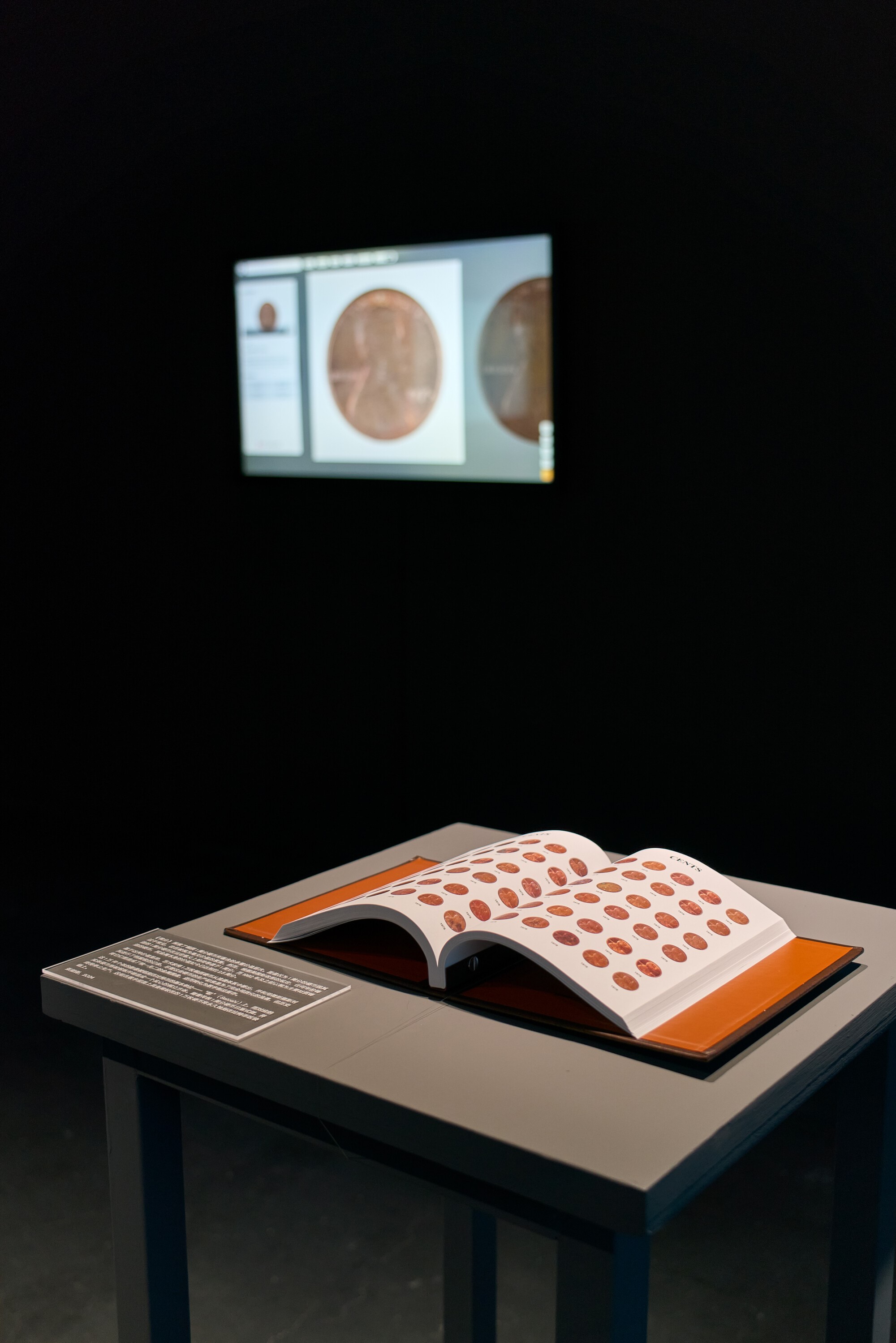 与《我们收购白色专辑》相似,《美分》(2017-2024)亦基于批量生产、看似别无二致的现成品创作,由一万枚1982年以前铸造、因含铜量而具有更高物质价值的美国1美分硬币构成。张能傑拍摄了自己收藏的每一枚硬币的照片,记录其独特的磨损与斑驳,然后将这批硬币熔铸成一块31公斤的铜立方体。原始硬币的图像亦以数字化方式铭刻于比特币区块链上,从而将实体货币的数字影像与虚拟价值体系进行了关联。艺术家以观念性的探索引发我们对时间、永恒以及物质价值评估方式演变的思考。观众可通过触摸屏设备或书籍浏览这一收藏,观察数十年流通在每枚硬币上留下的细微磨损与斑驳。随着实体美分硬币逐渐退出流通(美国铸币局已于2025年11月永久停产该硬币),这块沉甸甸的铜立方体以其可触知的坚实存在宣示价值的物质性,这一项目亦成为献给曾经广泛流通的硬币及其所代表的经济转型的多媒介纪念碑。