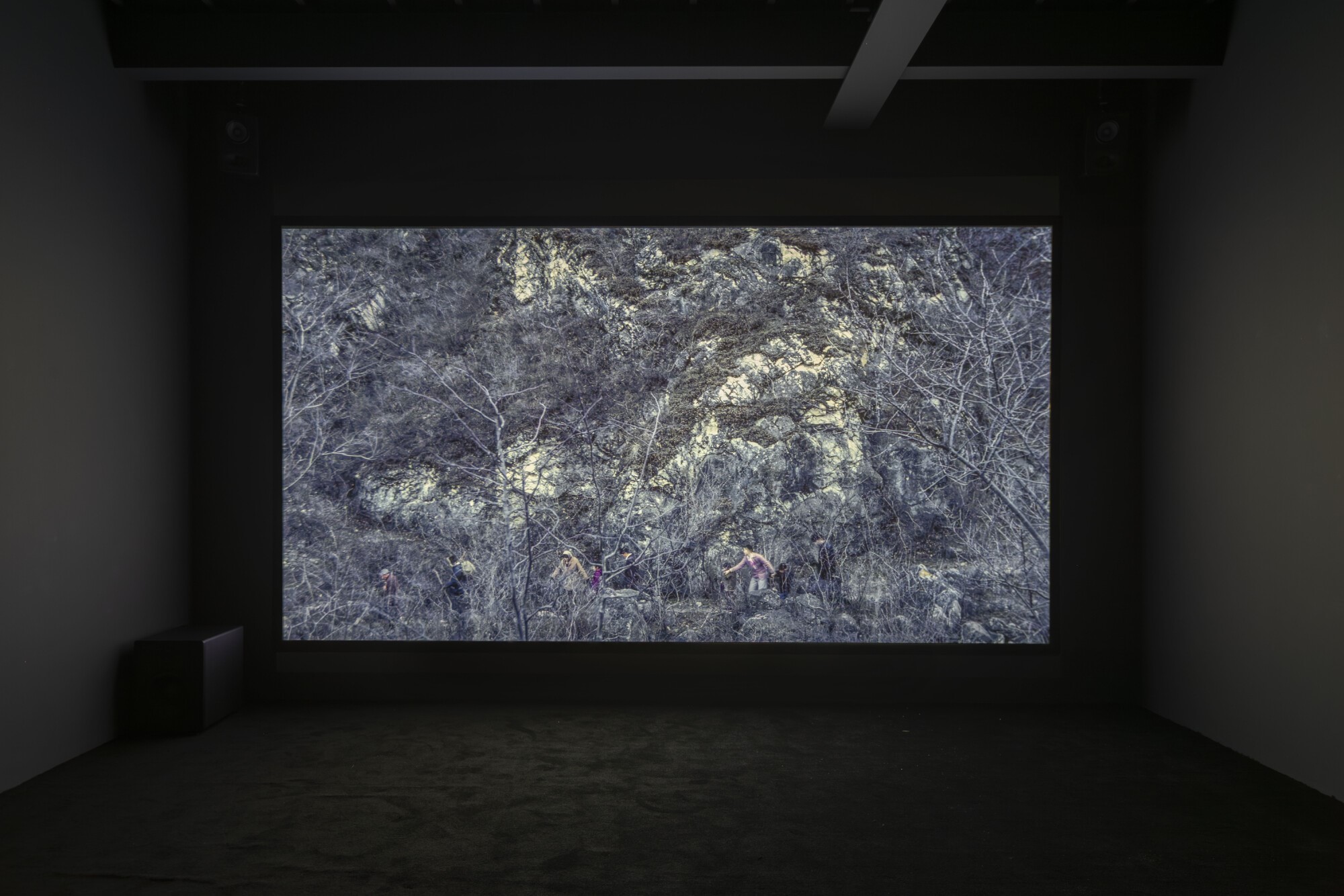 除同名影像外,展览还首次展出五件杨福东的最新影像创作与一系列早期作品,共同构成艺术家对于“影像—记忆—生命”关系的思考。《少年少年》(2025)是一部以16毫米彩色胶片拍摄的5频影像装置。作品以散点式的手法,重构了艺术家在1980年代北京军队大院中成长的青少年时光的一些零散记忆。影片中,少年们奔跑、练拳、候车、戏水、穿行玉米地,仿佛在度过一个不会结束的漫长夏日。杨福东借此探讨影像如何承载记忆:那些懵懂天真而又孤独惆怅的瞬间,最终被凝固在胶片的物质性痕迹之中。同样用16毫米彩色胶片拍摄的单频影像《在颐和园》(2024-2025)描绘了一位男子与一个小男孩在颐和园中徘徊与游荡的场景,时间的结构在影像中悄然错位,宛如午后半梦半醒的迷离瞬间。单频影像《县长县长》(2024-2025)呈现了一个时间与地点不明的集体迁徙场景。村民们在暮色渐浓的山道中穿行,空置的屋舍仍留有生活的余温,历史与现实的界线在此被悄然构筑成一种想象中的家乡地方志。《后房—嘿,天亮了》(2001)中,几位身着旧式军装的男子在城市的清晨中如梦游般行走,展现了艺术家对影像如何表达情绪与梦境的早期探索。
