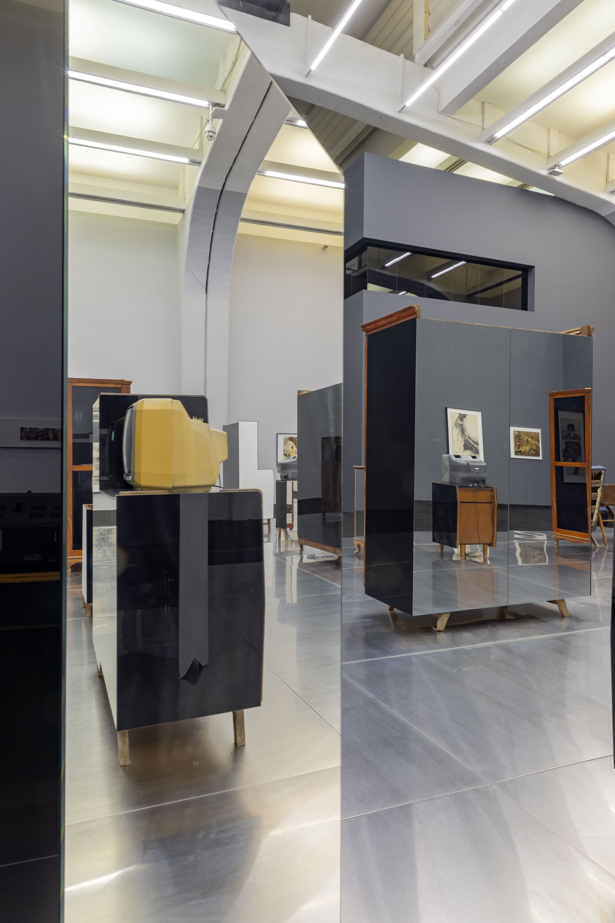 此外,本次展览还呈现多件跨媒介绘画与装置作品:《乐郊私语》(2025)是一组15联绘画装置,灵感源自南宋画家马远的长卷《西园雅集图》,艺术家结合极具个人风格的图式语言,以文人“出行”的意象与展厅另一端那座如迷宫般、难以走出的“香河”村庄呼应。断续的画面对应了长卷绘画需逐段展开的观看方式,也宛如被切分却接连的电影镜头,是艺术家对其“绘画电影”概念的又一次探索。装置《哺乳期》(2025)的主体部分由上世纪80至90年代香河地区常见的旧家具和旧电视机组成,真实的影像记录让私人记忆延伸至具身空间。家具被不同明暗度的镜面和玻璃覆盖,观众仿佛置身于一个如园林般幽微、时间失去坐标的流动空间。而旧电视机中播放着2000年初艺术家从上海回到香河老家拍摄的真实生活记录的影像,这些未经布置的画面似乎构成了《香河》的某种前身。