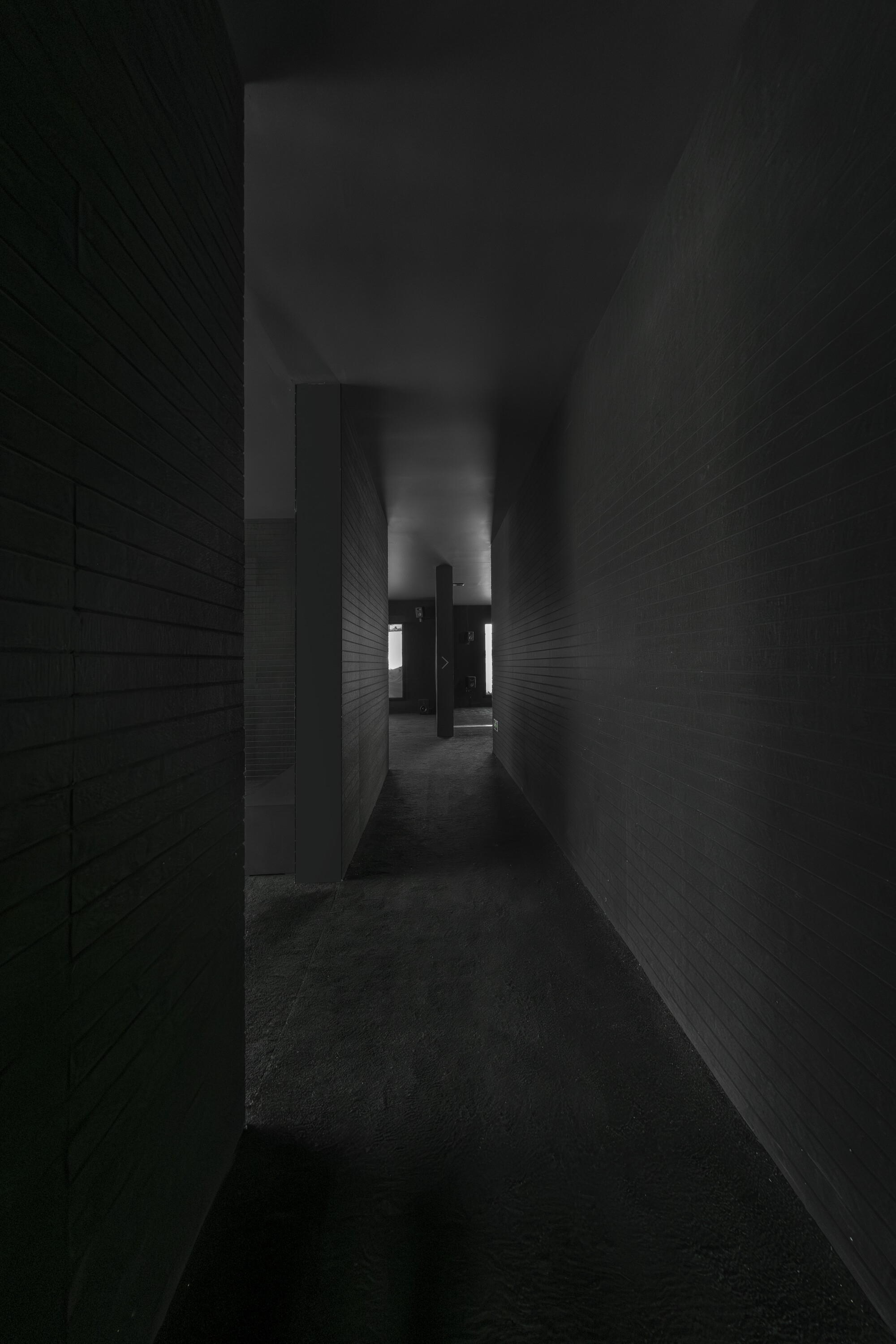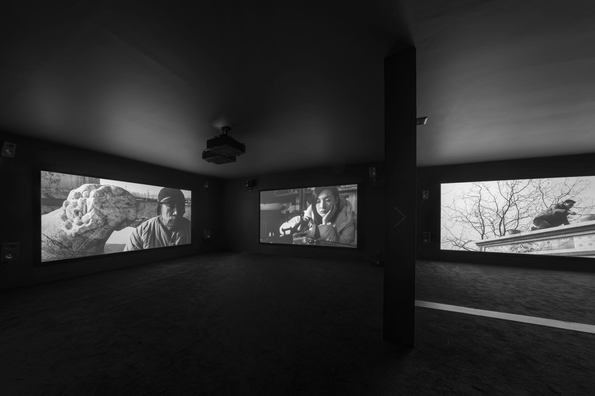 展览空间以“迷宫”“城楼”“广场”等多种象征性空间形态为结构,配以黑白与多层次灰色调,形成既具秩序感又充满诗意的场域。此外,艺术家拒绝设定单一的观展路线,通过多通道与多向的空间布局,让观众在展厅中或徘徊、或折返,甚至迷失方向,仿佛没有固定的起点与终点。光线的运用强化了这种错位的体验,使影像叙事与空间叙事共同指向一种模糊而多维的身体感知。本次展览空间由UCCA展览部杨翛然设计。