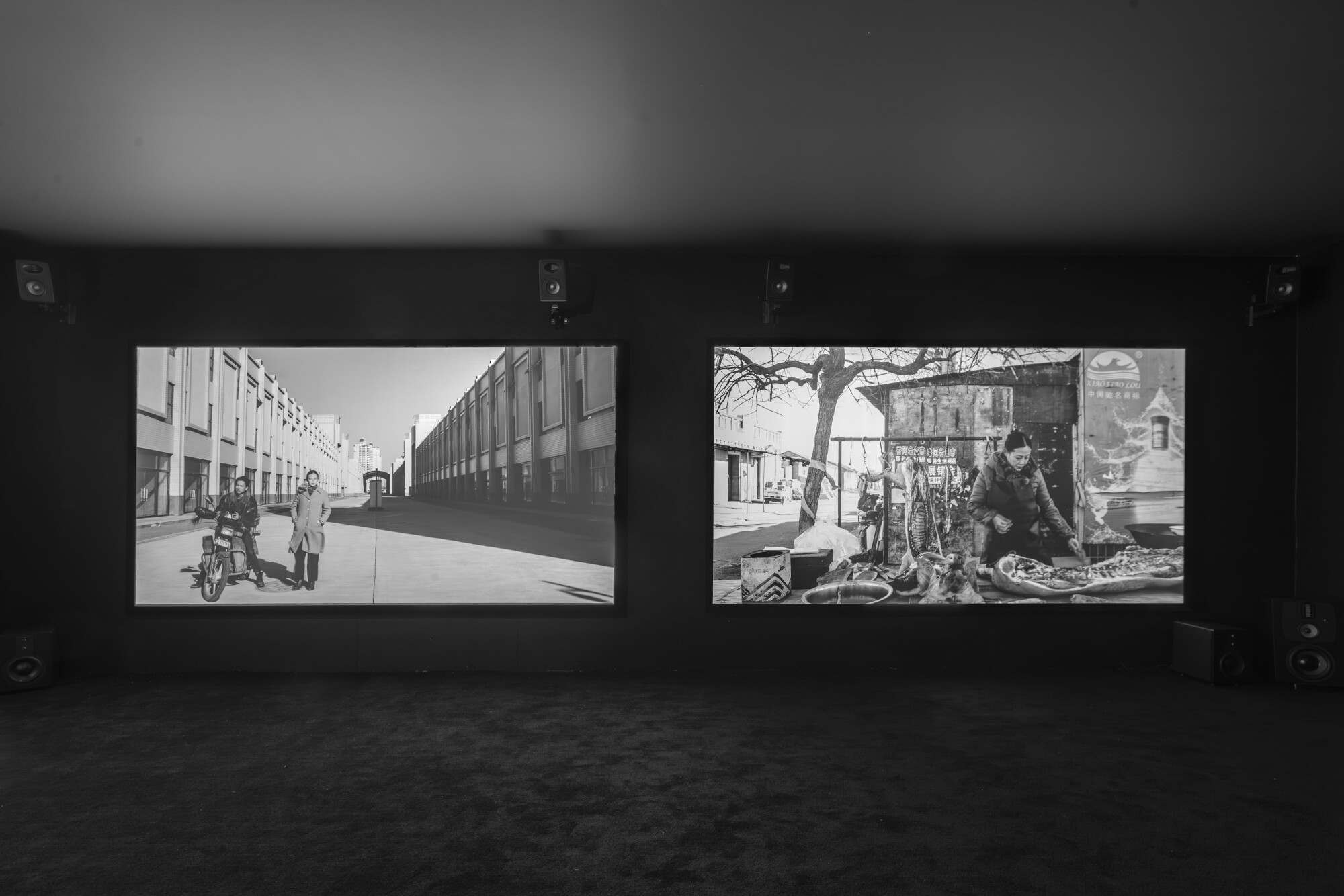 展览标题“香河”取自杨福东的家乡——河北香河县,但在展览中,艺术家却消解了其作为地点的具体指涉,将之抽象为一则交织着私人情感、集体记忆与历史时间的隐喻。作为展览的核心作品,15频黑白影像装置《香河》(2016-2025)凝聚了杨福东超过二十五年的构思与创作。早在1997年拍摄完首部长片《陌生天堂》后,艺术家便萌生了以家乡为灵感的创作念头。2016年,他带领团队在香河县城与附近村庄辗转拍摄了47天,直至2025年秋才完成后期制作。作品以一位年轻母亲在村中筹备春节庆典的日常情景展开,其间穿插着生老病死的碎片化情节与日常的劳作场景,呈现了北方乡村生活在光影流转下既真实又陌生的面貌:人们在日复一日的劳作中度量时间的流逝,而那些偶然闯入的超现实场景,如同梦境的缝隙,打开了另一重时间维度。