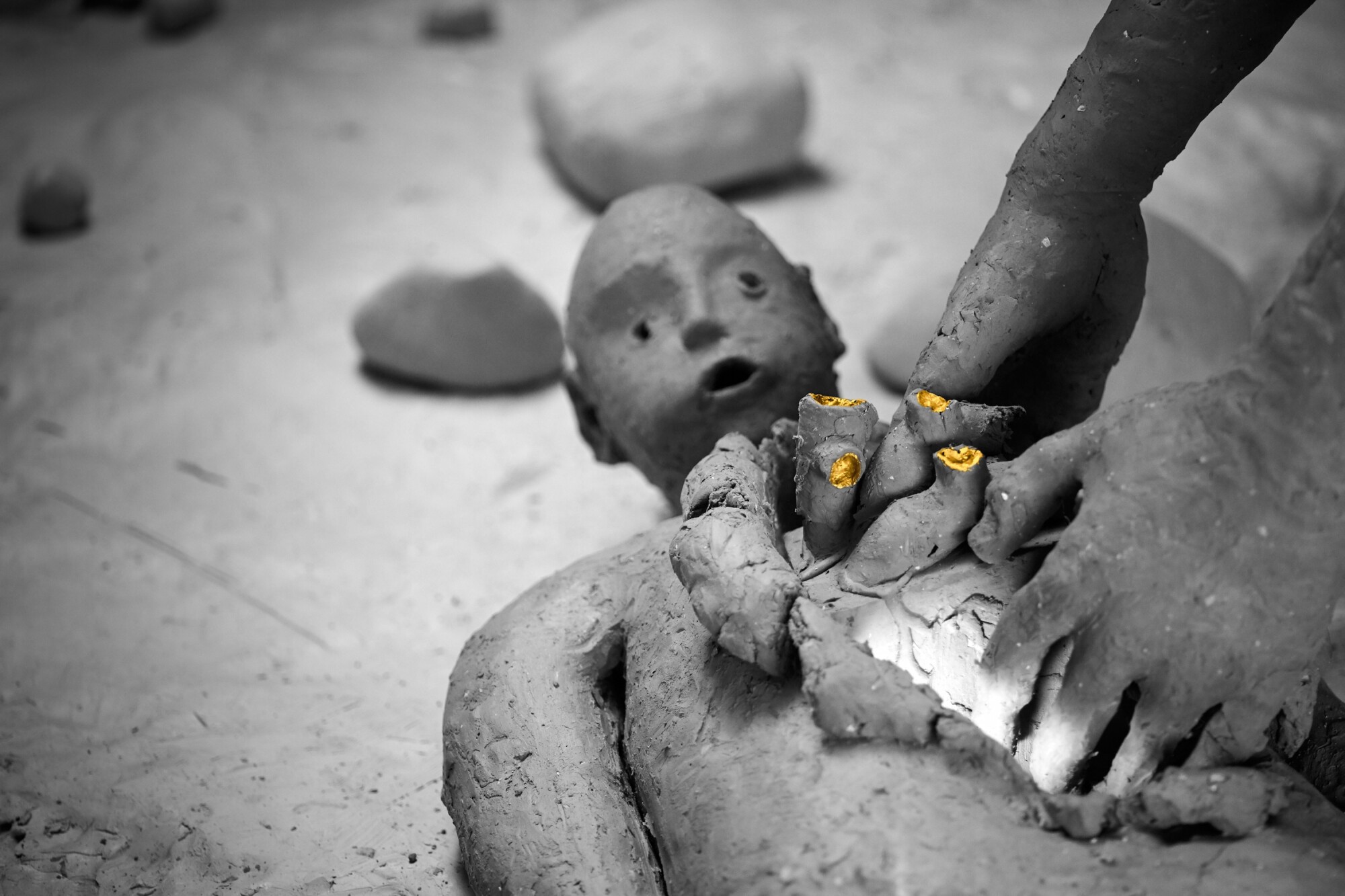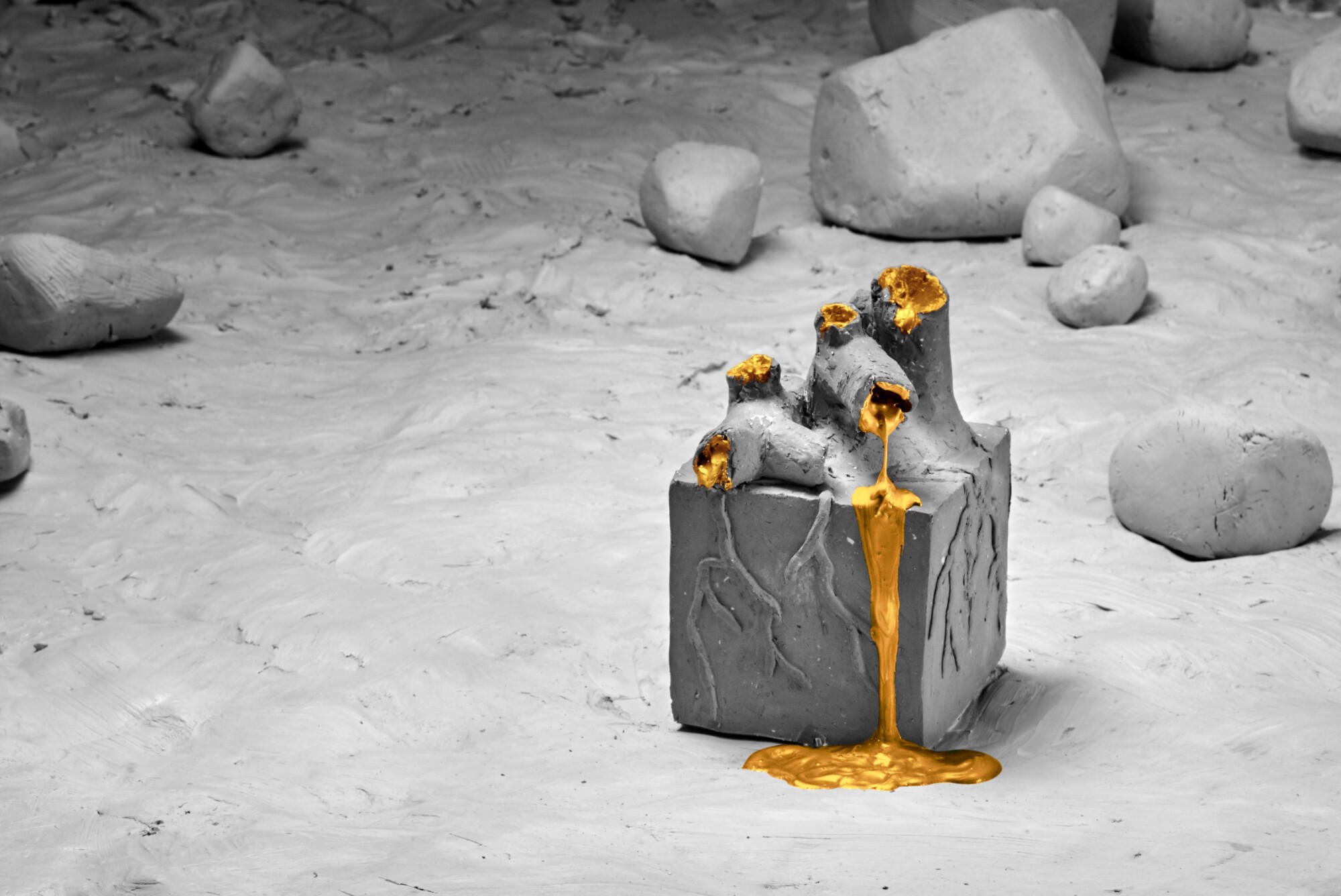 Multi-channel mud stop motion animation video installation, color, sound, 2.5:1, 9'27"