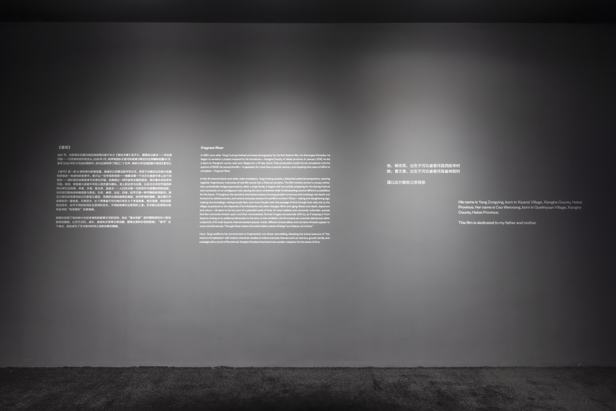 Fragrant River is at once a spiritual return to the terrain of personal growth and homesickness, and a sustained meditation on time itself. Fifteen screens are dispersed across nine interlocking, nested chambers, forming a labyrinth of memory. As viewers navigate these spaces, their movement becomes a means through which time unfolds, positioning them as participants within the work’s narrative structure. The exhibition also includes a documentary on the making of this work, offering insight into how the artist transforms personal recollections into moving-image narratives that resonate with shared human emotion. As the inaugural chapter of Yang’s long-term “Library Film Project,” Fragrant River serves as a point of entry into the artist’s expansive inquiry into the inner life of the individual. The works assembled within this framework comprise an intensely personal catalogue of images, while remaining open, waiting to be read by each viewer.