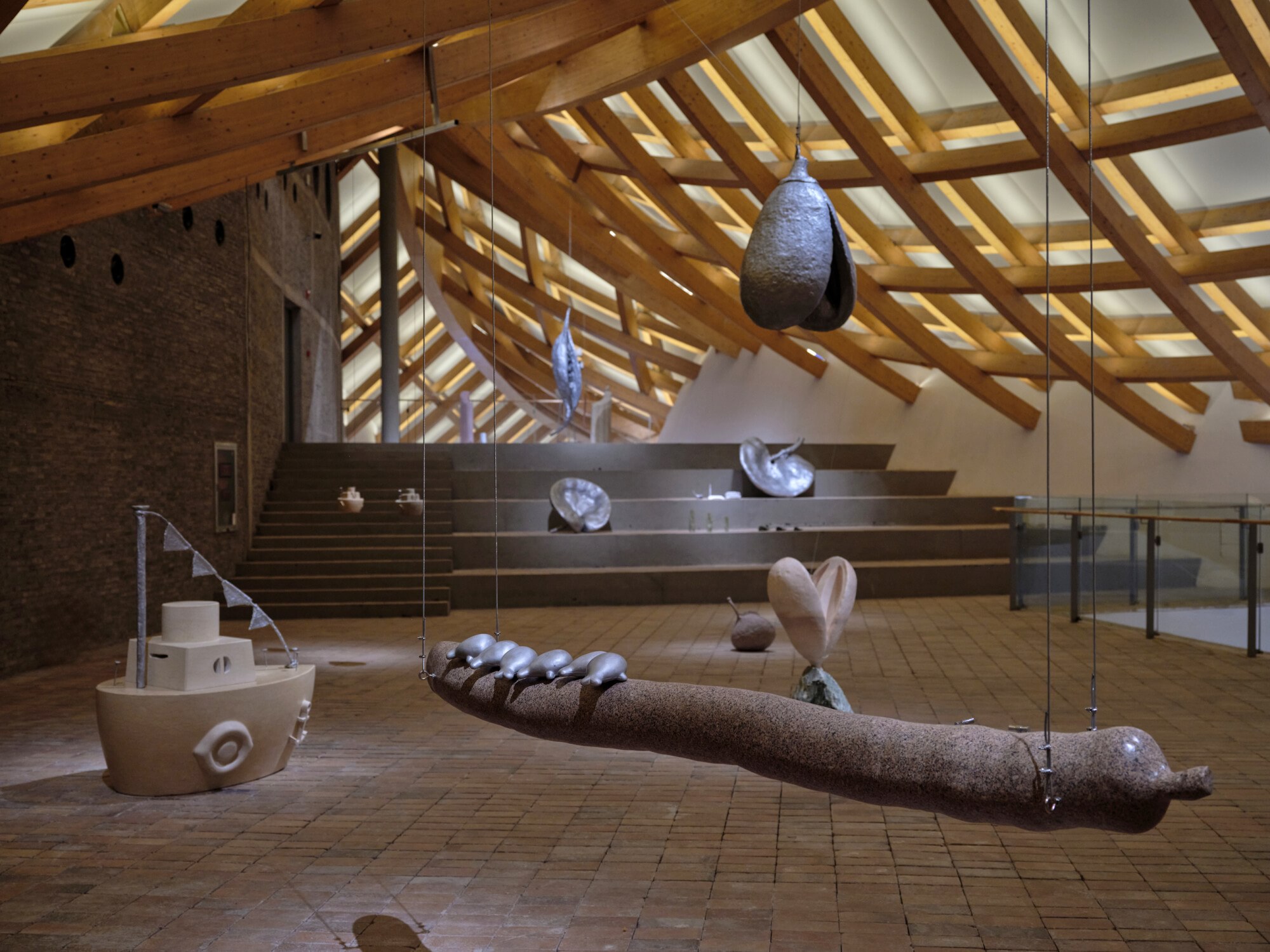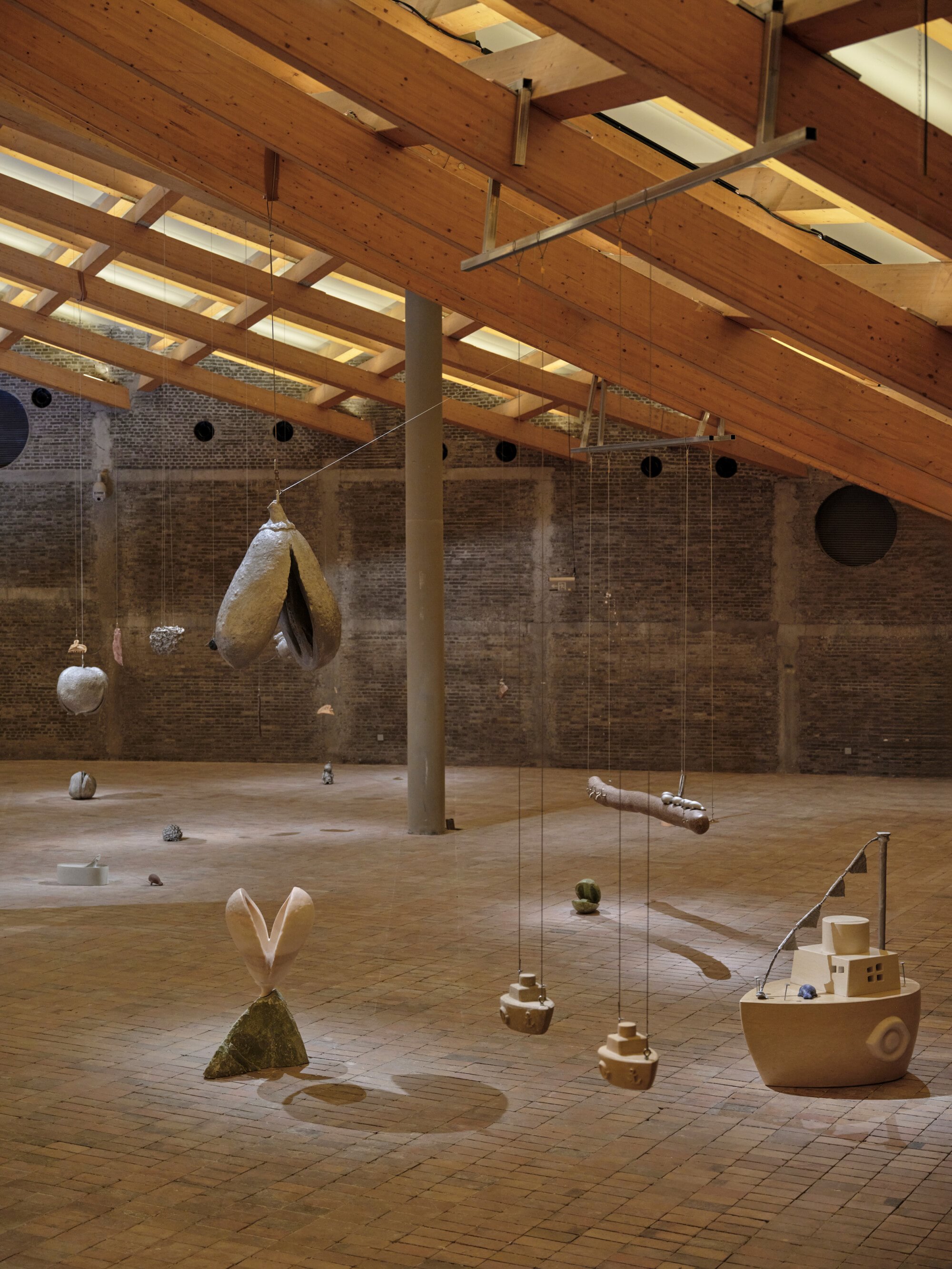 张移北于二层展厅呈现的“流水与雀鸟之声”,则将目光锚定于当下,以“物候”为切入点——聚焦自然与人工、生命与技术、物质与感知之间的交织与共生。由UCCA委任创作的装置作品《流水与雀鸟之声》(2026)以伪装成树木的通信基站为核心意象,将铸铝、大理石及拾得物融入空间结构,构建出一个可供观众自由穿梭的感知场域。艺术家从研究自然界周期性变化的物候学中获得启发:正如季节与气候塑造花开与迁徙的节律,那些勾连环境与生物的多层交织网,同样塑造着我们感知世界的方式。尽管标题唤起流水与雀鸟的自然声景,展览现场却是寂静的。这种沉默以及由大理石雕琢而成的种子和内脏器官意在激活观众自身的感知,提示观众注意那些平日不易察觉的物质流动与信息交换——包括信号、风、种子以及身体内部器官的协作——所形成的“隐形的物候网络”。鼓励漫步其间的观者将自身视为某种“感应器”:如果我们对所有的信号保持开放,我们能听到什么?借用唐娜·哈拉维提出的理论框架,我们或许可以将自己视为一张“共生发”(sympoiesis,万物共同造就彼此)网络中的一个节点——在静观中体会人工与自然如何交融,技术如何内化为生命的一部分,物质如何默然记录下普通人与环境共生的叙事。此外,作品《呼吸的食谱》(2024)形似贝壳,却嵌有合页与锁扣的形态,在展览语境中与周啸虎检视航海遗存的作品遥相呼应,共同延展了物质叙事的维度。
