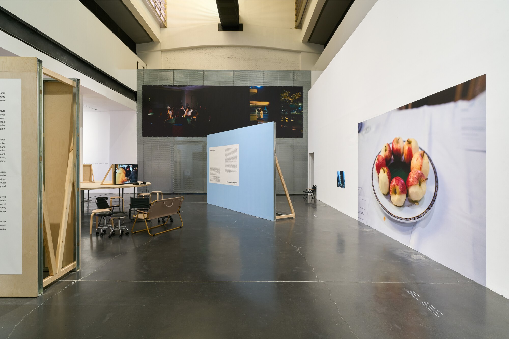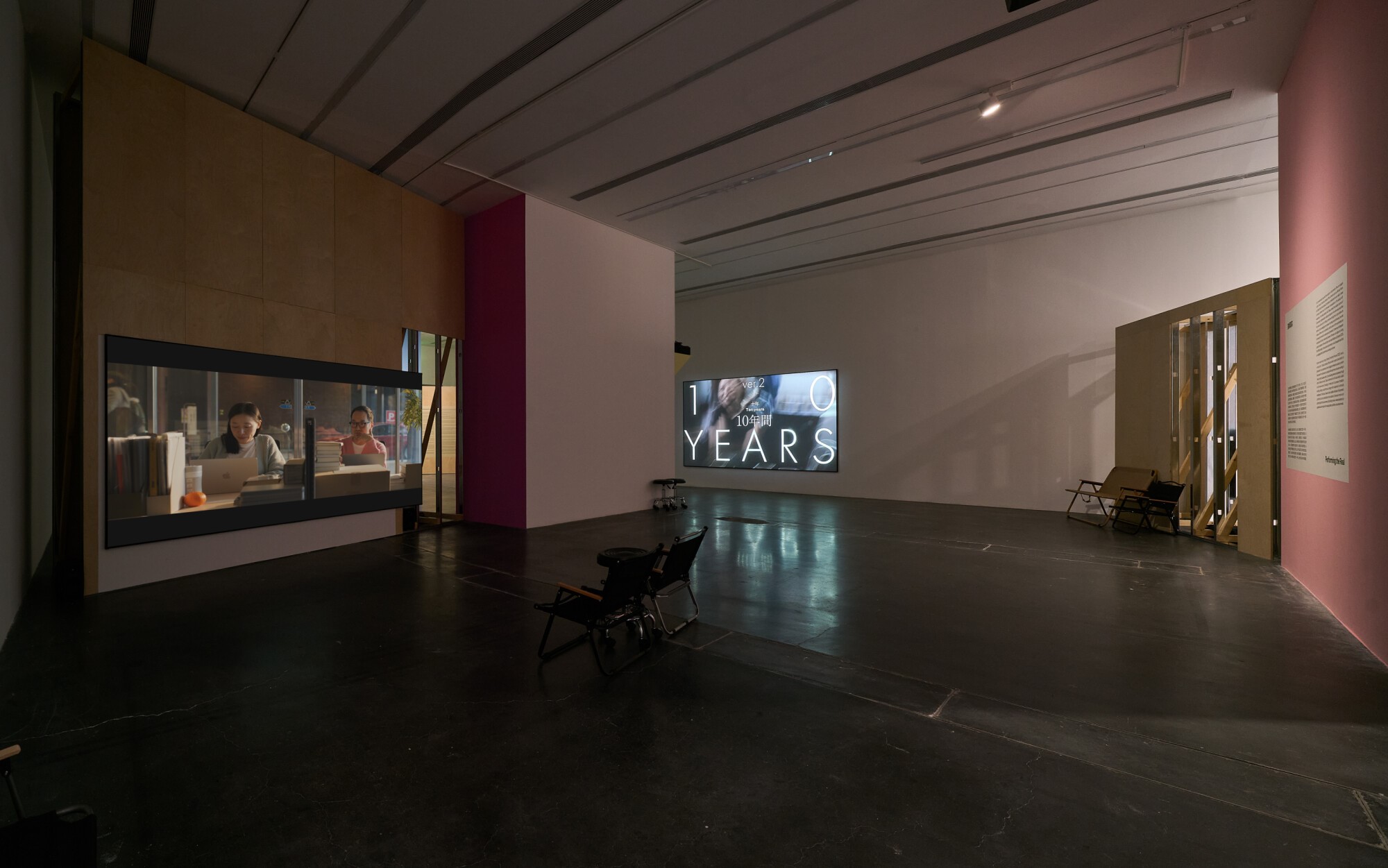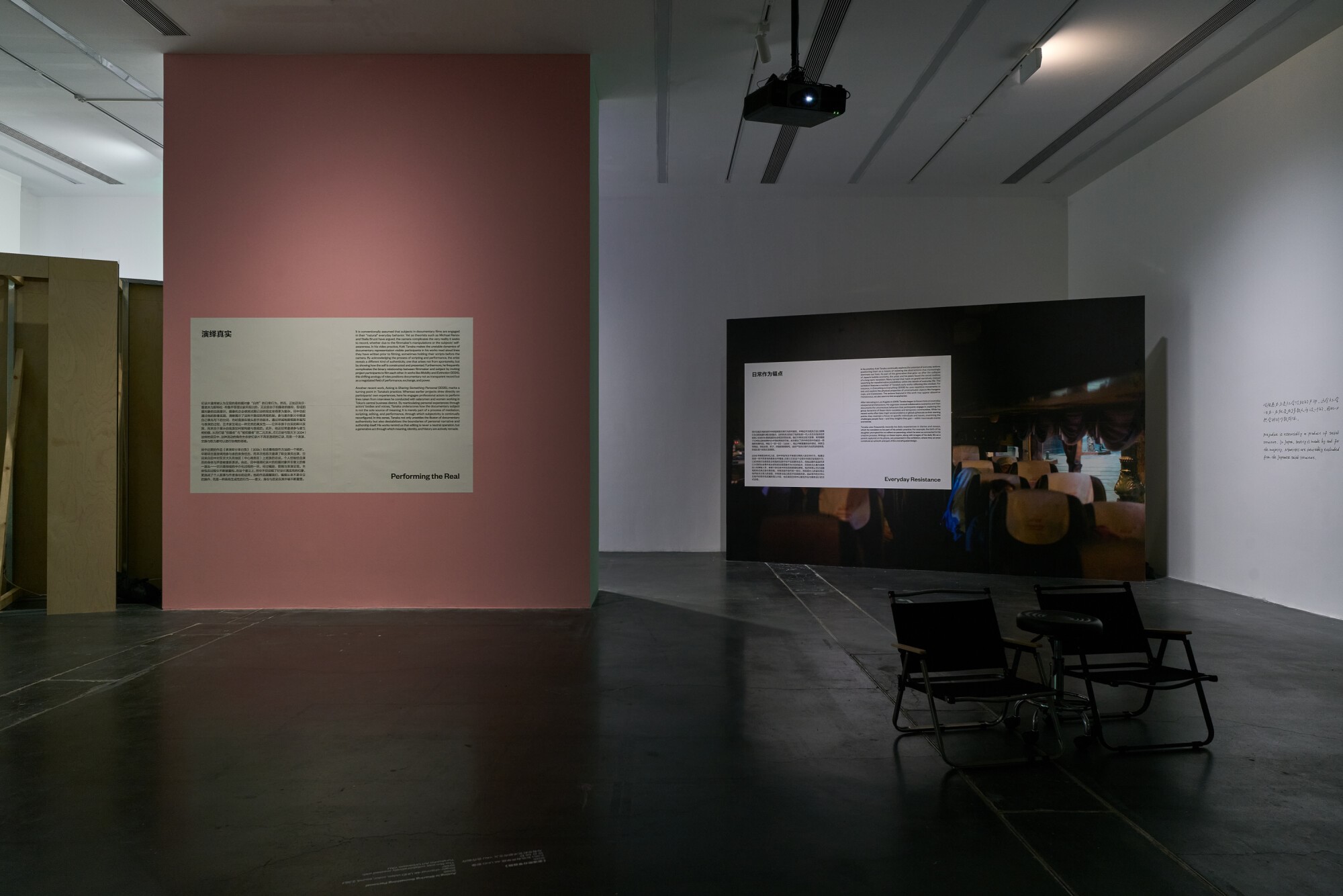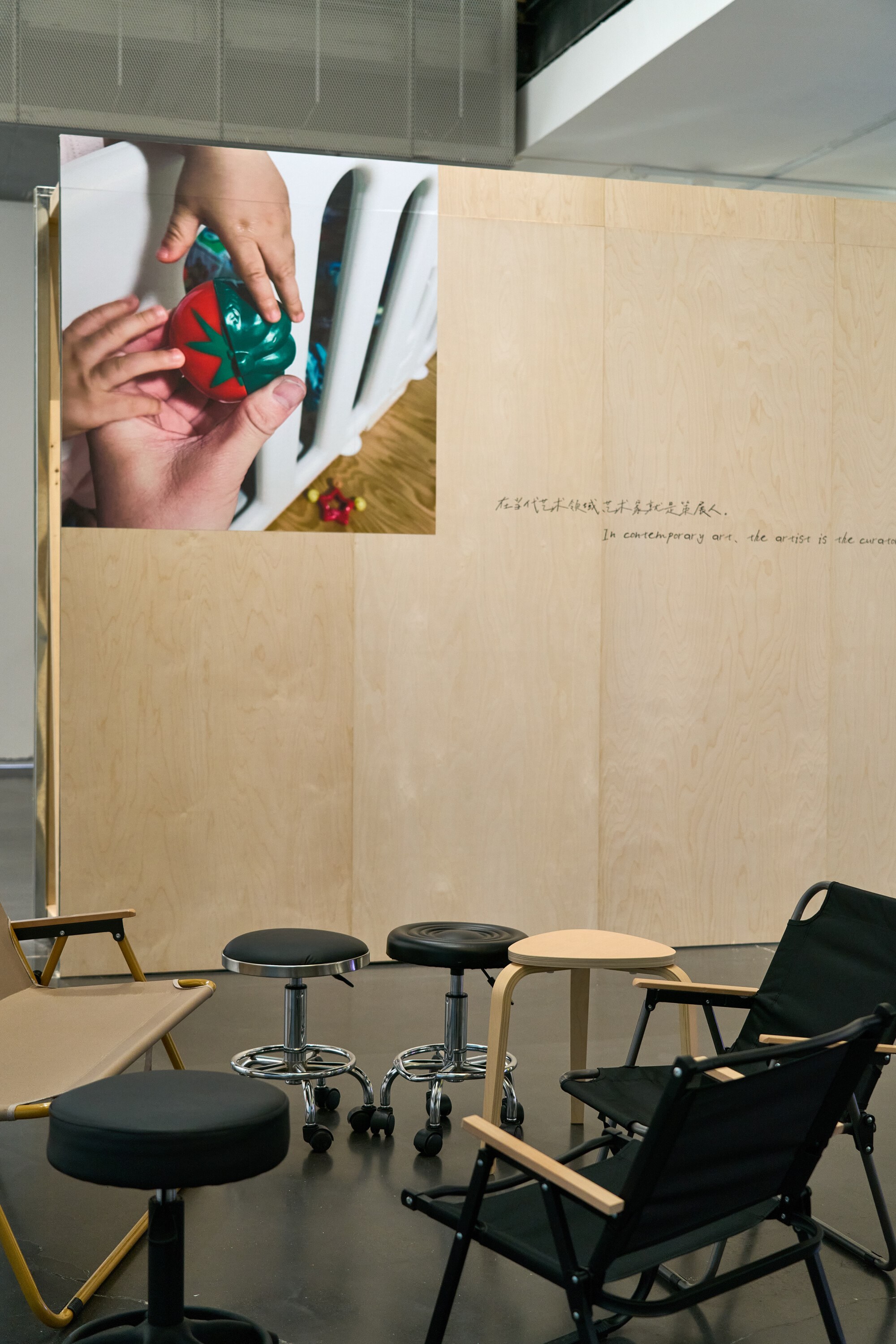 本次展览在空间设计上也延续了“临时共同体”的主题。作品的屏幕不依附于固定墙体,而是被安置在简易木质结构上;展厅中散落的椅子可被观众自由移动。观众因而可以在观看过程中随意调整观看视角,或即兴地自发聚集,或独自停留。空间的开放性与不确定性,使展览本身也成为一个不断生成、又随时可能瓦解的“临时共同体”。