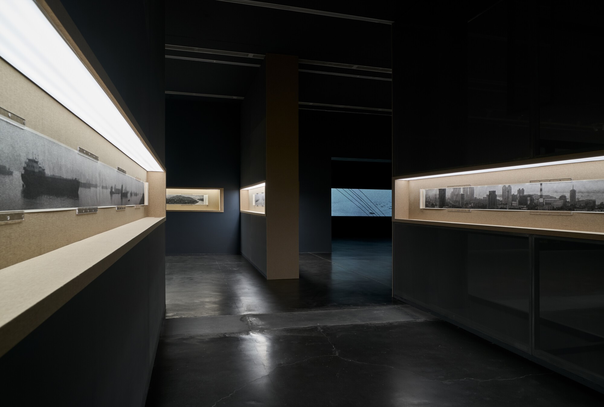《攀枝花》(2012)拍摄于被誉为“万里长江第一城”的攀枝花市,作品视角由被群山包围的工业城市边缘延伸,建筑与山脊构成两个相对的三角形几何结构,使城市与山体不再对立,而是彼此呼应与对照。在《虎跳峡》(2012)一作中,艺术家以俯拍的取景方式将远山的水平线与江水共同塑造出一个略带错位感的空间;展览特别将该作品横向铺陈于一张弧形布条之上,而非采用竖向壁龛式陈列,还原了拍摄视角所蕴含的空间感和江水湍流而下的速度感。而在上海长江大桥拍摄的作品《海门》(2012)画面中,长江入海口的宽阔江面几乎消解了地平线,只有近处右下方一艘意外闯入的运沙船成为时代的痕迹。