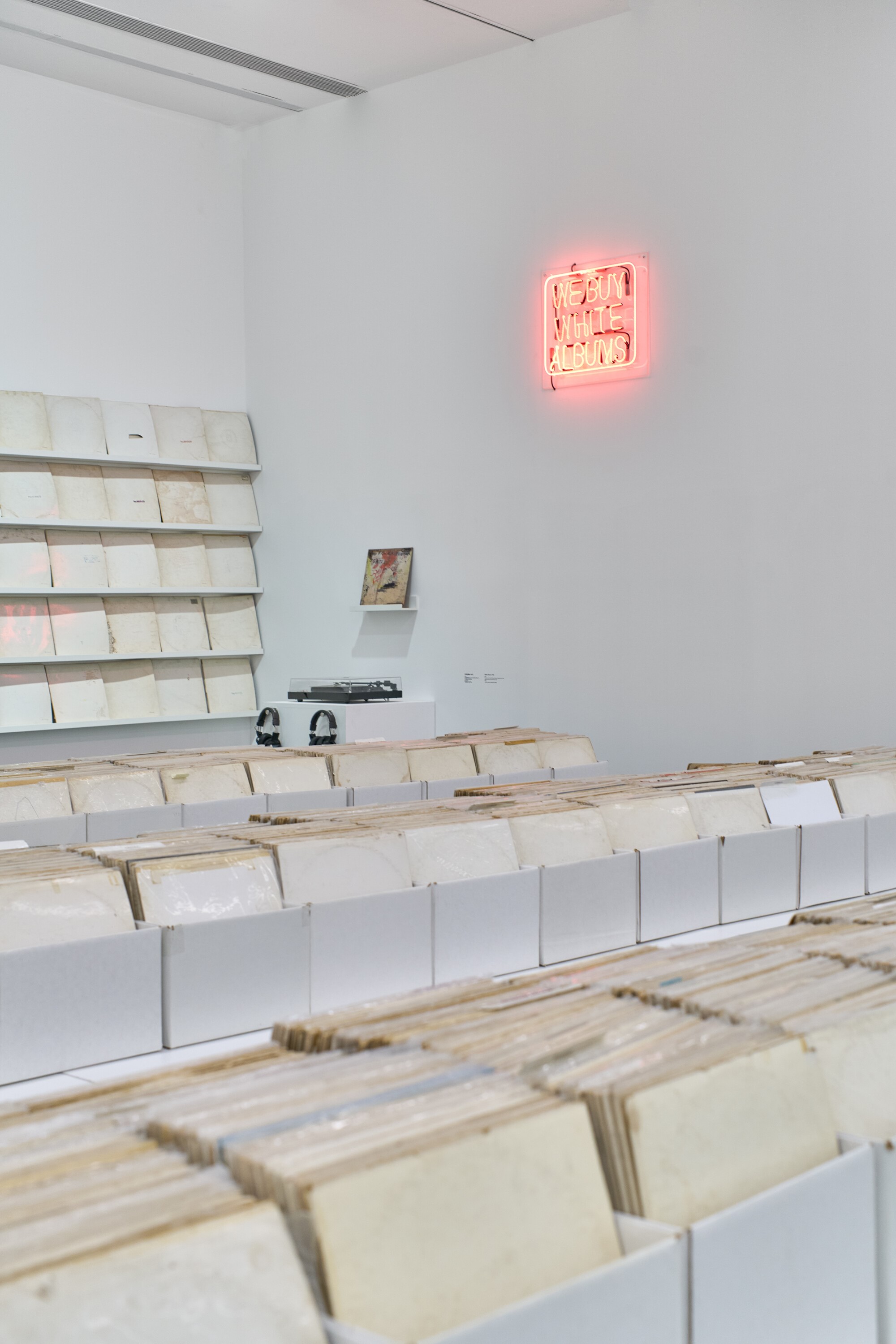 展览的核心作品之一《我们收购白色专辑》(2006-2025)以不断积累的实物档案的方式展开,乍看像一间唱片店,但其中的唱片并不出售。此作品所收集的皆为英国摇滚乐队披头士1968年发行的同名专辑(即广为人知的“白色专辑”)。这张专辑几近空白的封面由波普艺术家理查德·汉密尔顿和披头士成员保罗·麦卡特尼共同设计,将极简主义美学引入流行文化。张能傑十五岁时购得第一张“白色专辑”,自2006年开始系统性搜寻这张首版唱片,并依据压印的独立编号进行归档;2013年在纽约艺术机构Recess的临街空间首次公开展出这一不断增长的收藏。陈列于此供观众翻阅乃至聆听的唱片,带有注解、污渍及其他磨损痕迹,封套上的随手涂鸦、留言与生活痕迹,构成一部“白色专辑”发行数十年以来的社会史,颠覆了“空白封面”的概念。此外,观众在此还可以聆听张能傑创作的一件声音作品。艺术家将最初收集的100张“白色专辑”的音频叠加,将生成的录音压制为黑胶唱片;唱片上的划痕、表面噪音以及微小的转速差异,使音乐逐渐转化为致密的音响纹理,既凸显了媒介的物质性,亦强调了原专辑音乐中本就存在的实验性色彩。