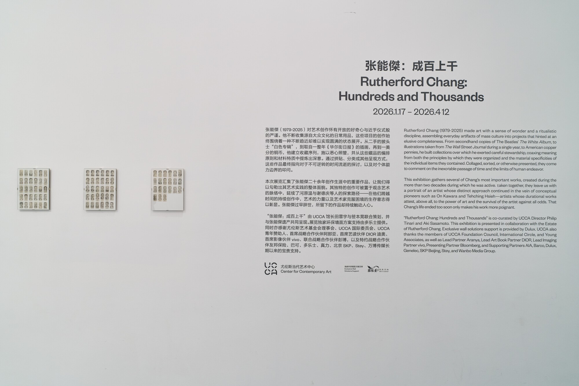 本次展览独家环保墙面方案支持由多乐士提供。同时亦感谢尤伦斯艺术基金会理事会、UCCA国际委员会、UCCA青年赞助人、首席战略合作伙伴阿那亚、首席艺读伙伴DIOR迪奥、首席影像伙伴vivo、联合战略合作伙伴彭博,以及特约战略合作伙伴友邦保险、巴可、多乐士、真力、北京SKP、Stey、万博传媒长期以来的宝贵支持。