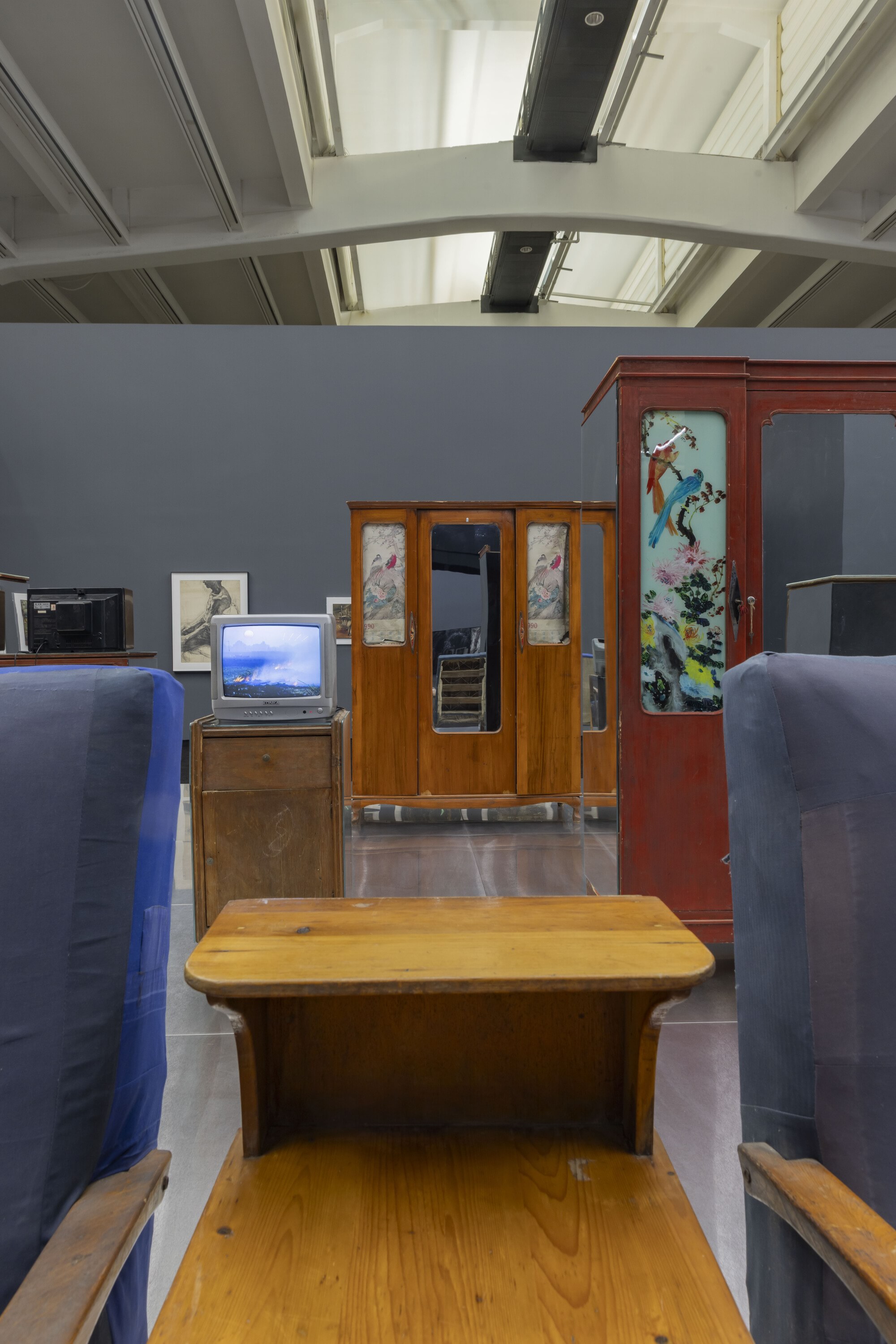 此外,本次展览还呈现多件跨媒介绘画与装置作品:《乐郊私语》(2025)是一组15联绘画装置,灵感源自南宋画家马远的长卷《西园雅集图》,艺术家结合极具个人风格的图式语言,以文人“出行”的意象与展厅另一端那座如迷宫般、难以走出的“香河”村庄呼应。断续的画面对应了长卷绘画需逐段展开的观看方式,也宛如被切分却接连的电影镜头,是艺术家对其“绘画电影”概念的又一次探索。装置《哺乳期》(2025)的主体部分由上世纪80至90年代香河地区常见的旧家具和旧电视机组成,真实的影像记录让私人记忆延伸至具身空间。家具被不同明暗度的镜面和玻璃覆盖,观众仿佛置身于一个如园林般幽微、时间失去坐标的流动空间。而旧电视机中播放着2000年初艺术家从上海回到香河老家拍摄的真实生活记录的影像,这些未经布置的画面似乎构成了《香河》的某种前身。