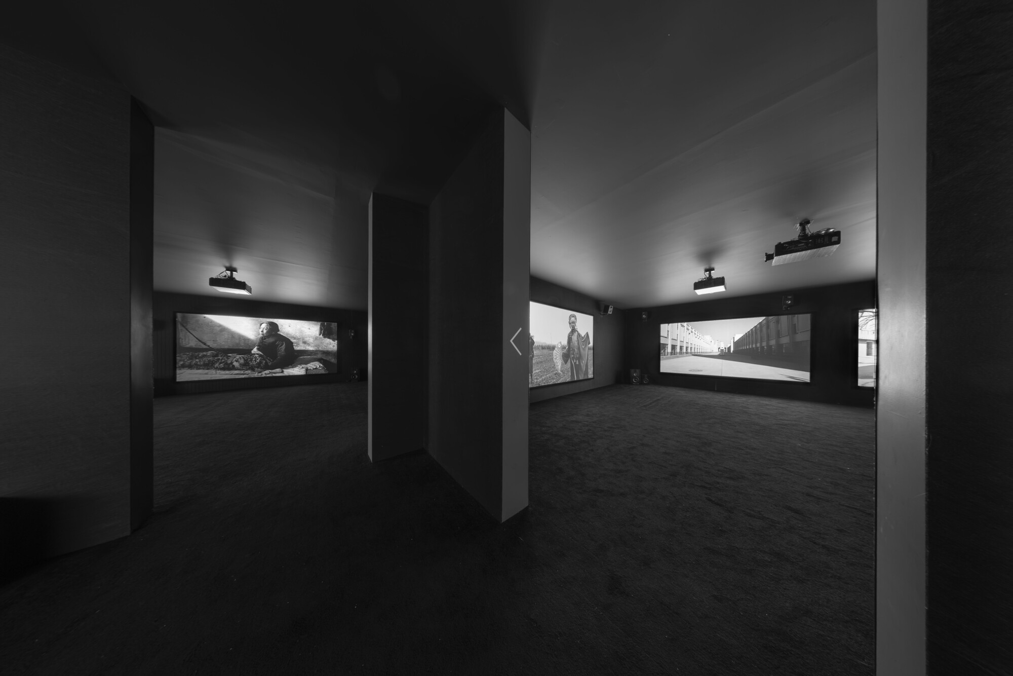 展览空间以“迷宫”“城楼”“广场”等多种象征性空间形态为结构,配以黑白与多层次灰色调,形成既具秩序感又充满诗意的场域。此外,艺术家拒绝设定单一的观展路线,通过多通道与多向的空间布局,让观众在展厅中或徘徊、或折返,甚至迷失方向,仿佛没有固定的起点与终点。光线的运用强化了这种错位的体验,使影像叙事与空间叙事共同指向一种模糊而多维的身体感知。本次展览空间由UCCA展览部杨翛然设计。